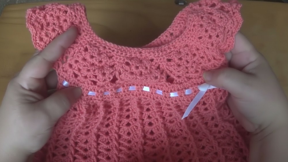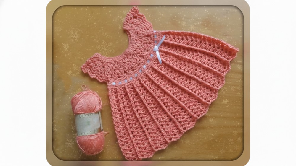 Many such dresses are made with light, baby‑friendly yarn (like cotton or soft acrylic), so the final piece feels gentle and cozy against a baby’s skin. Because the yoke is built first working outward from the neck the dress fits neatly around the shoulders before widening.