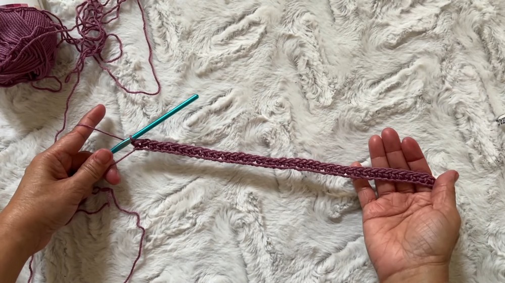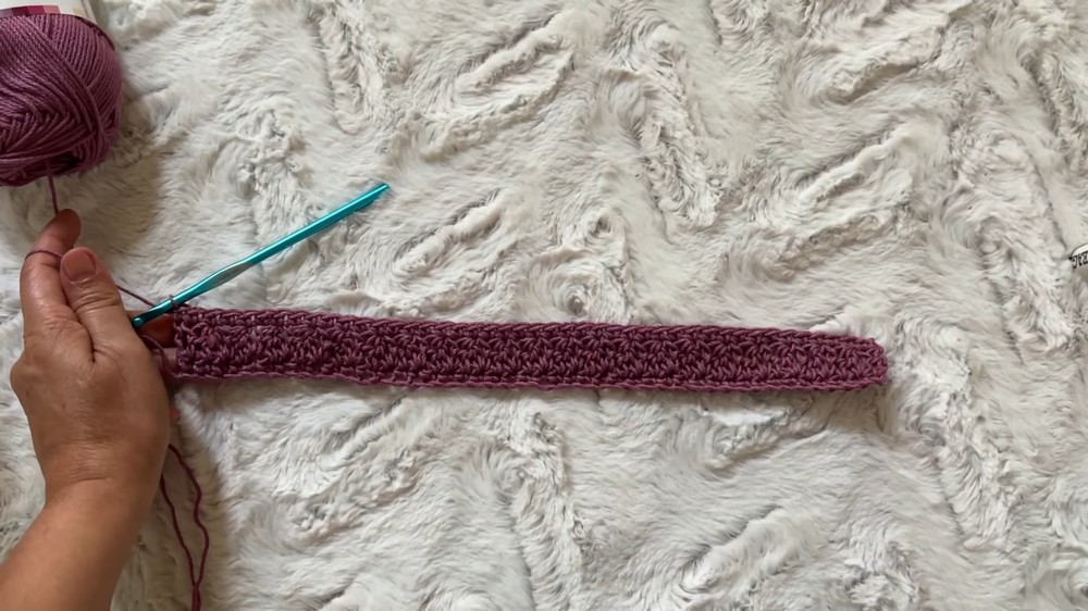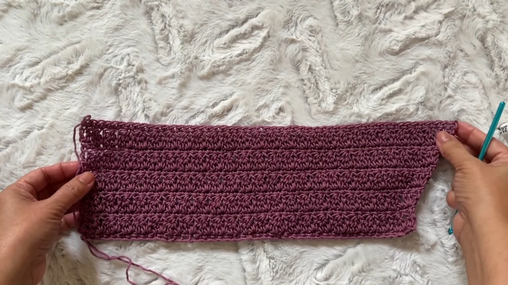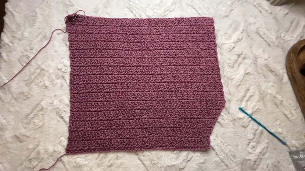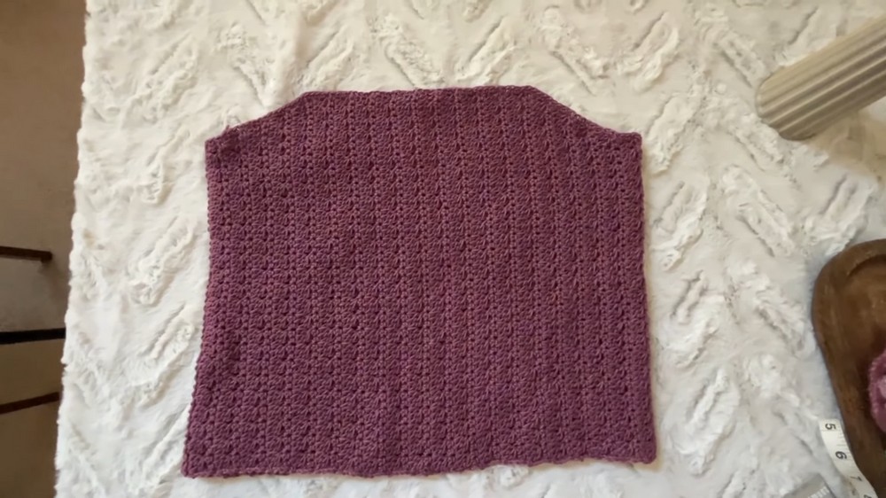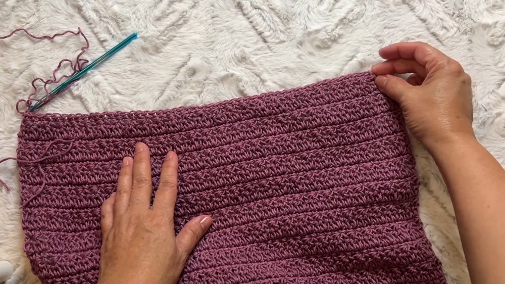 After crocheting the back length, the panel is folded and stitched together along the sides using the mattress stitch.