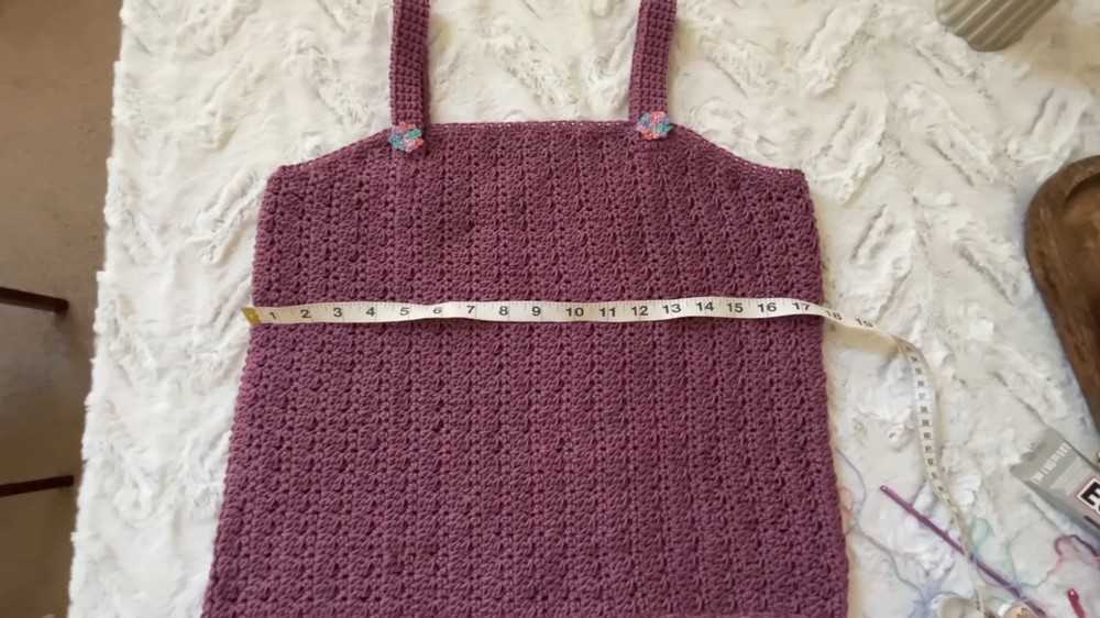 The crochet tank top begins with a single large panel worked vertically. Using a simple foundation row of single crochet stitches, the pattern then alternates between double crochet-three-together stitches paired with chain spaces, creating texture.
