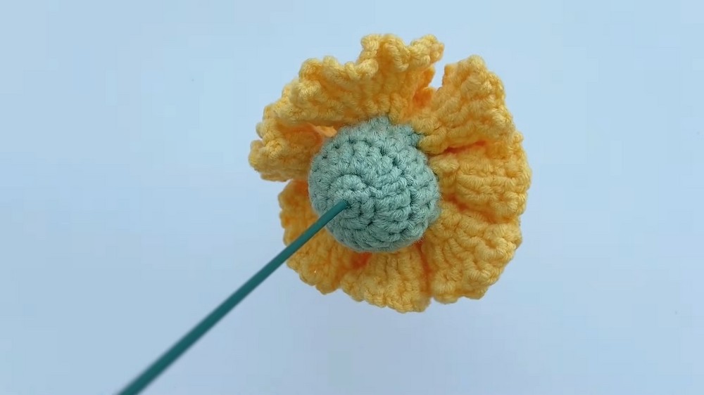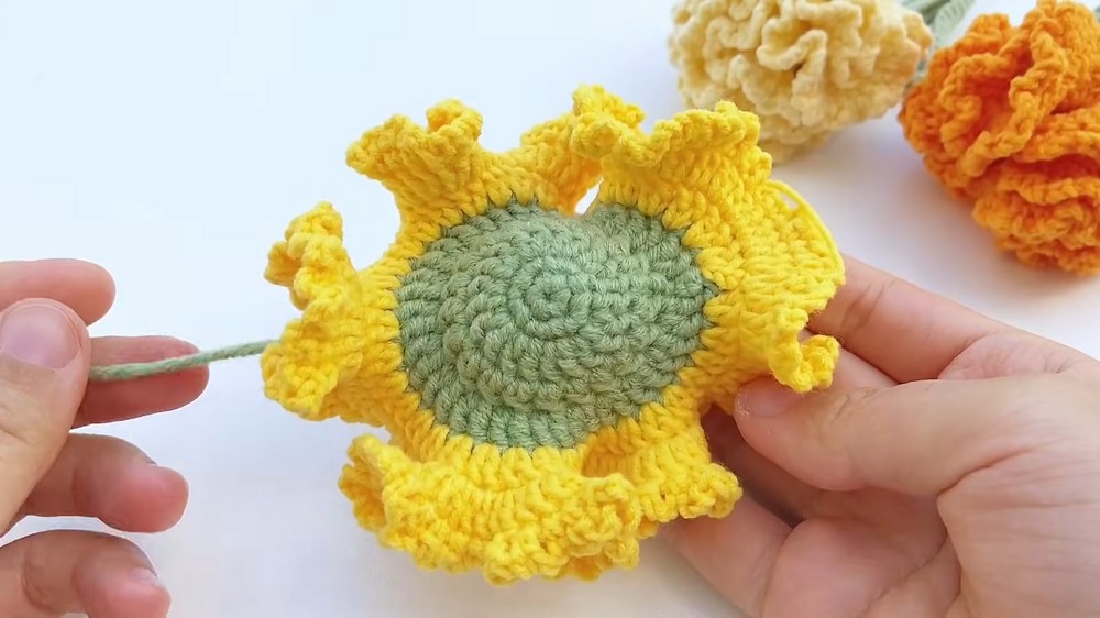 Once the base is complete, you switch to your chosen petal color, like vibrant yellow or pink—and perform multiple rounds of double crochet increases to establish the ruffled shape.