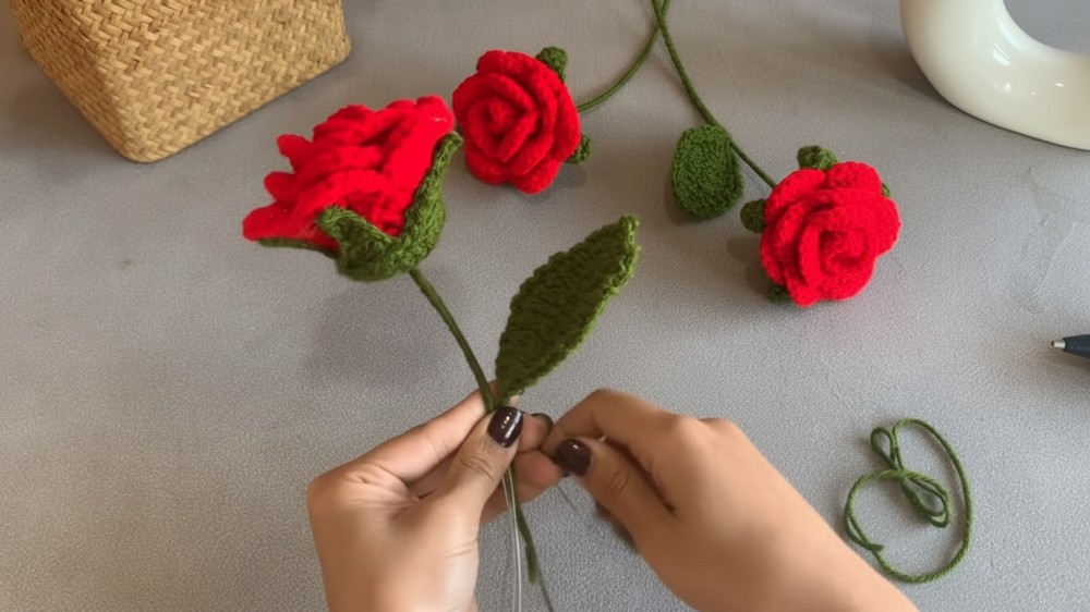 - Using a tapestry needle, sew the flowers and leaves onto the crocheted heart base.