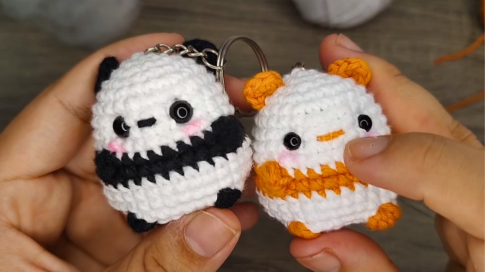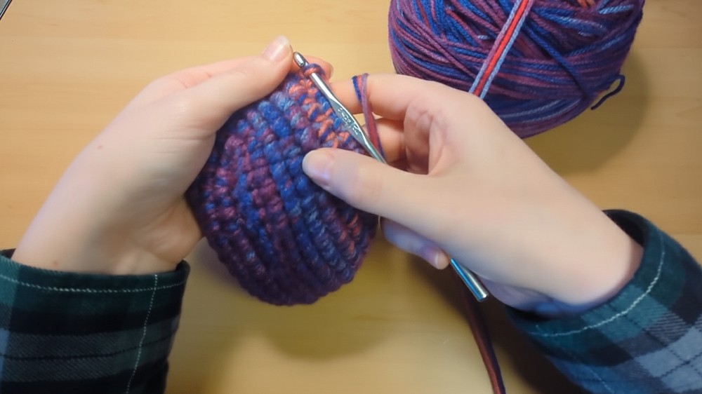 The process begins at the start, forming a sturdy foundation chain and working rows of single crochet and half-double crochet to shape the base and main body.