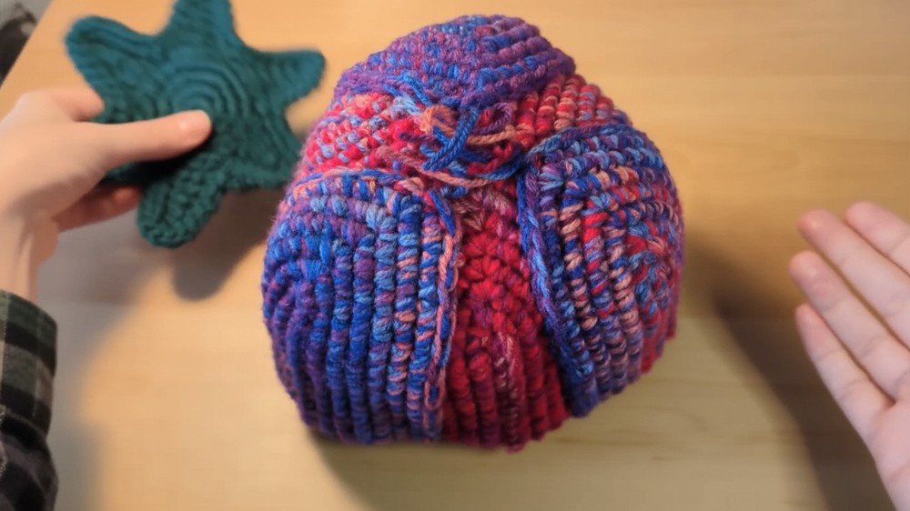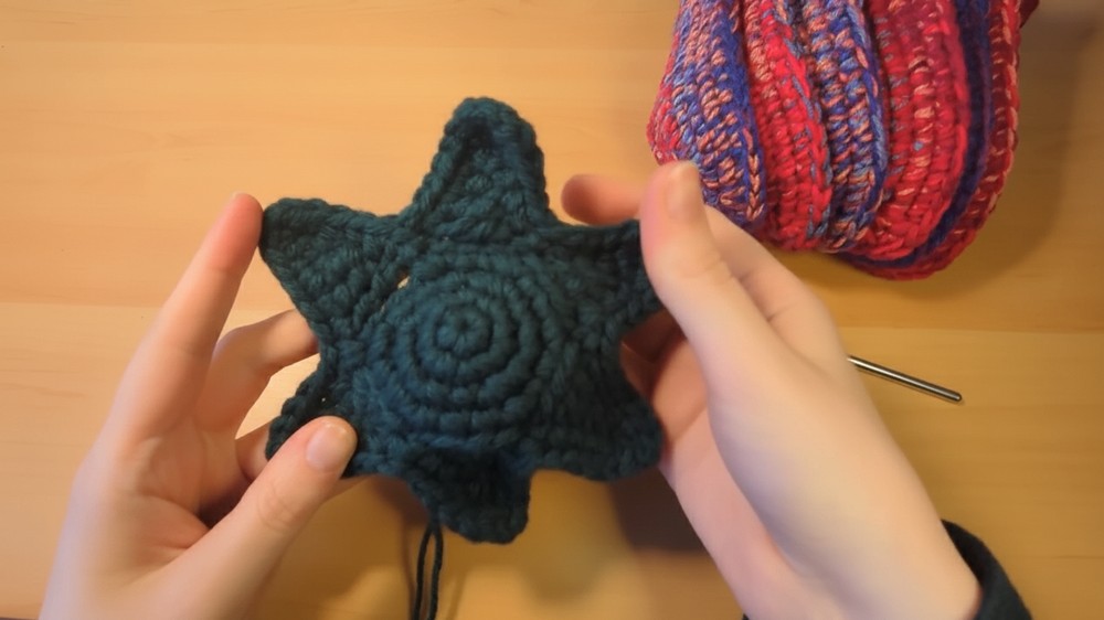 To keep your petals perfectly parallel while sewing the side seams, use a spare crochet hook as a temporary pin. Slide the hook through the layers of both petals to hold them in alignment; this is much easier and more effective than using standard stitch markers on such thick, tripled yarn.