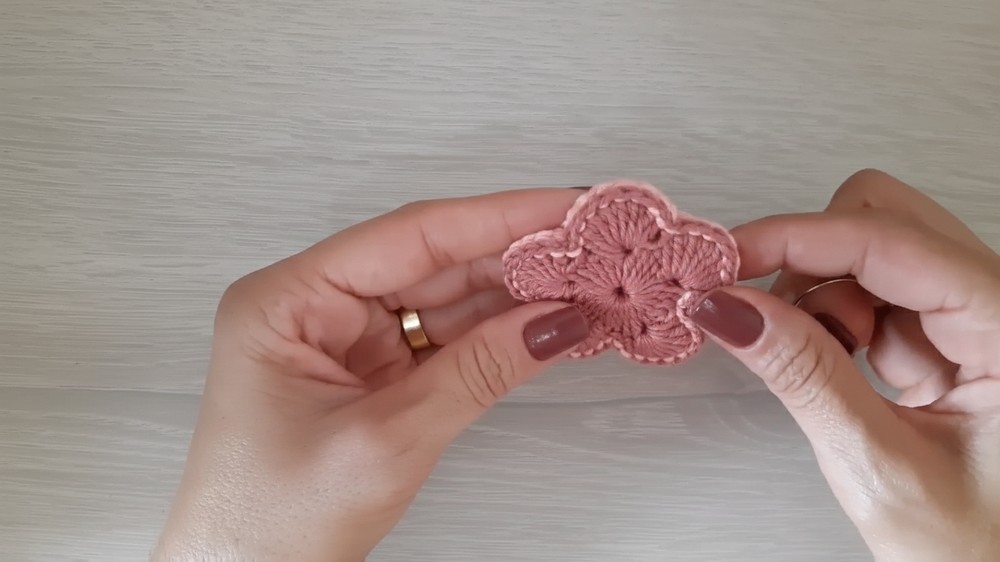 Slip stitch into the third chain of the next petal foundation, and repeat this process for the rest of the chain spaces.