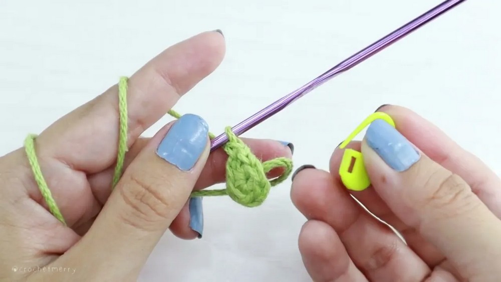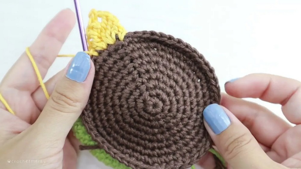 Next, switch to yellow yarn to crochet several petals around the center, forming the signature bright rays.