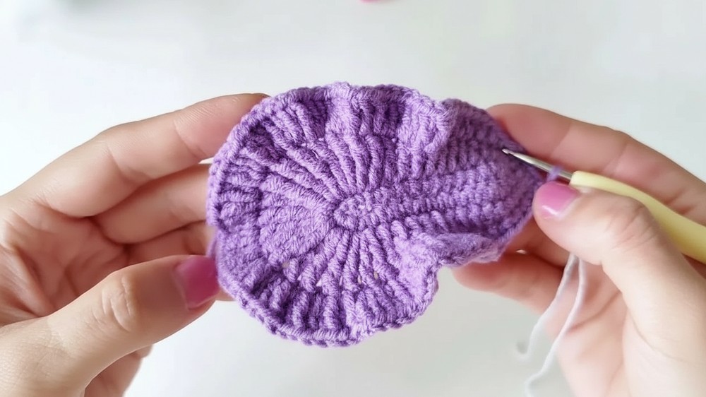 - Make one piece of the flower heart using purple yarn. This smaller internal piece adds dimension and realism to the flower.