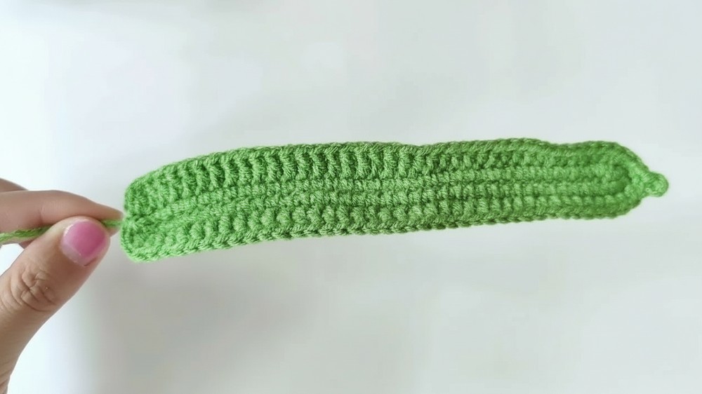 - Use green yarn for small flower leaves. Start with a slip knot followed by 11 chains.