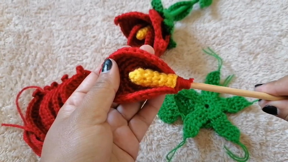 Yarn: Medium-weight yarn (suggested brands: Emmanuel or Angel) in Red (petals), Yellow (center), and Green (stem and leaves).