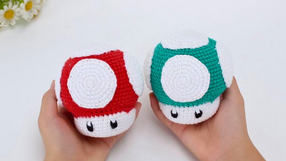 Color-Block Head/Body: The head and body are crocheted in one piece, incorporating sharp color changes (red, white, green) to define the outfit and mask.