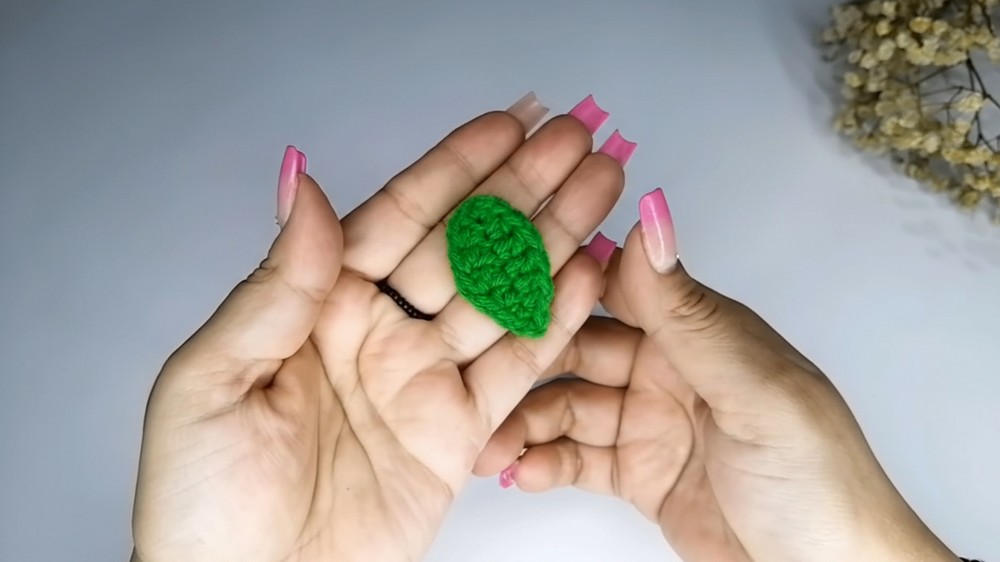 - Use green yarn to create the leaves. Begin by chaining eight stitches.