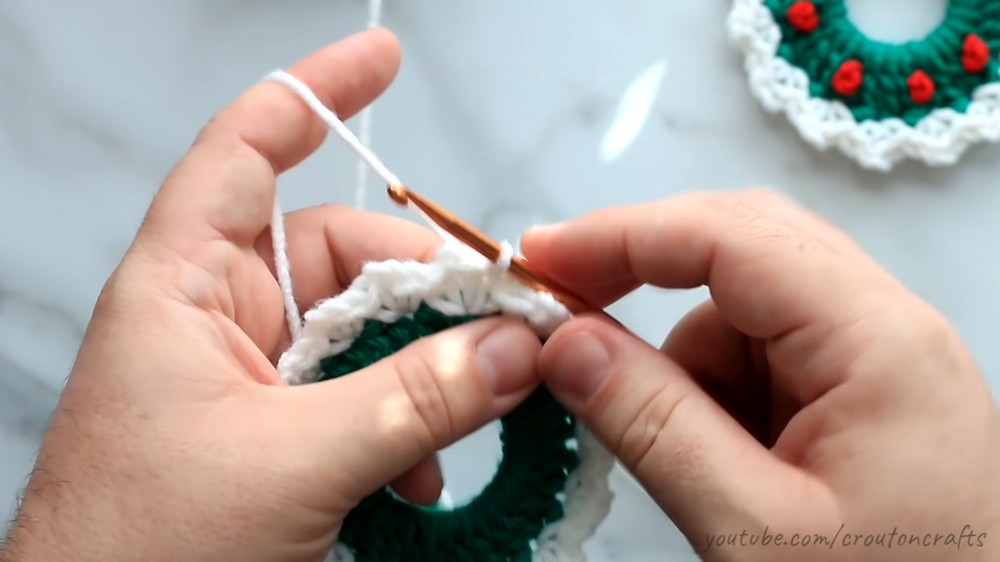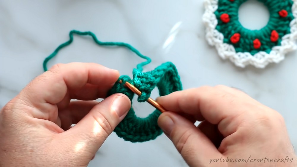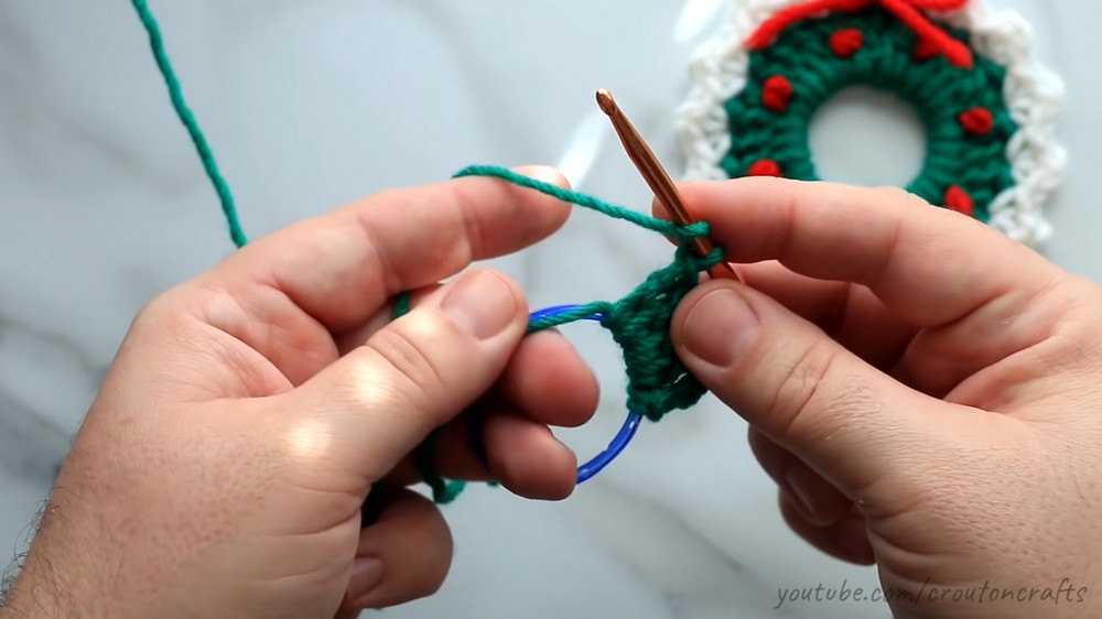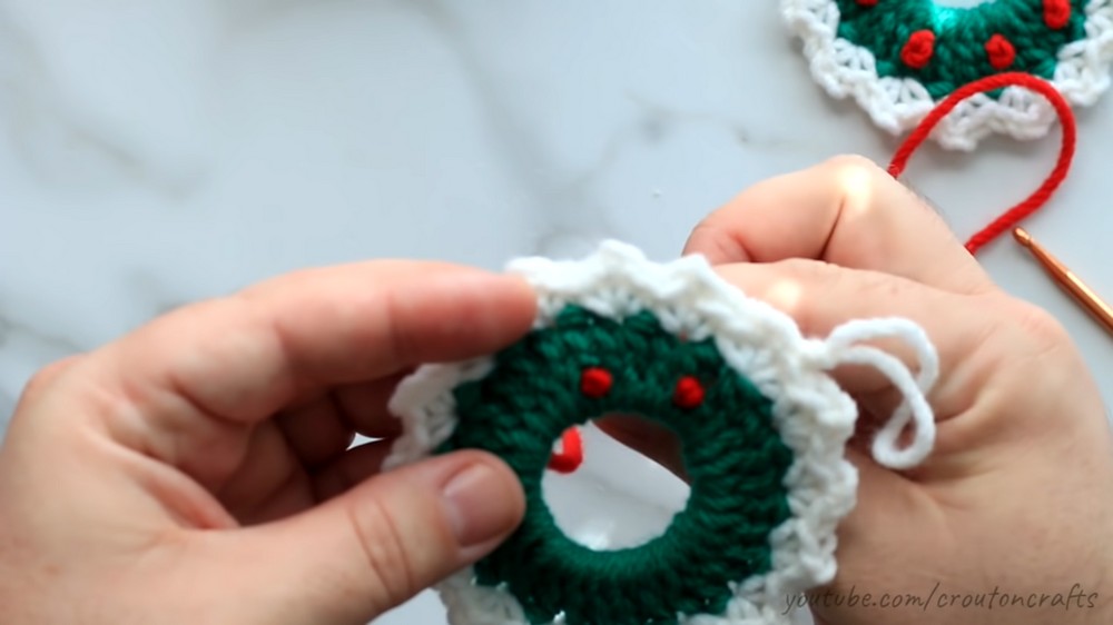 - Repeat every 4 stitches around the wreath for a total of 8–9 berries.