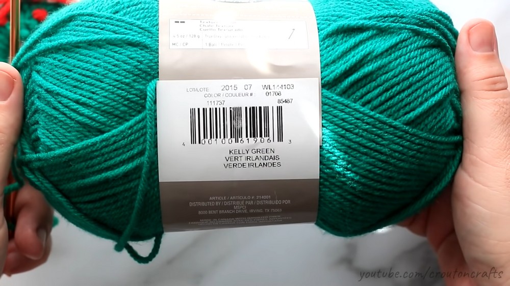 - Yarn in green, red, and white (or any colors of your choice). The tutor uses Loops & Threads Impeccable Yarn, color Kelly Green.
