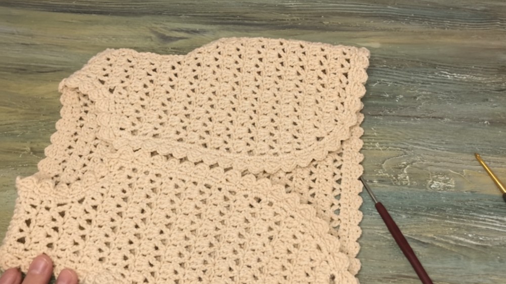 - Step 2: Crochet around the vest edges, creating a neat border. Use 3 single crochets in wide spaces and 2 single crochets in narrower spaces for a clean finish.