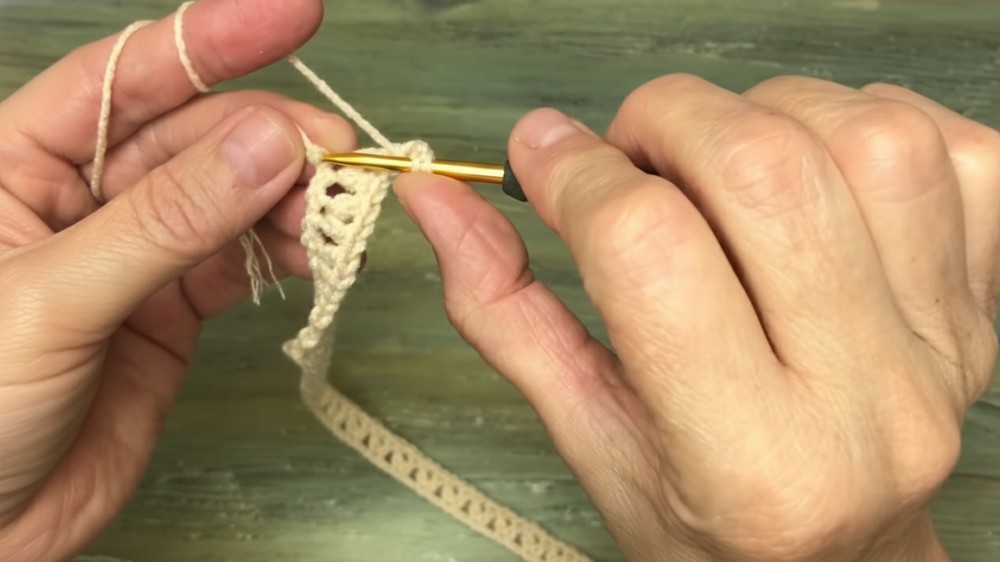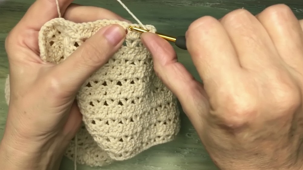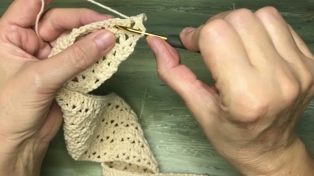 - Step 4: Continue this V-shaped pattern across the row, ending with a single double crochet on the final chain.