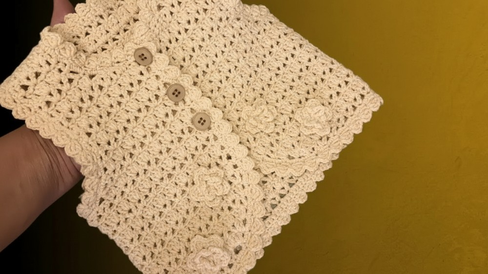 - Customizable: Optional flower motifs enhance its elegance, and spaces in the crochet edge are cleverly used as buttonholes.
