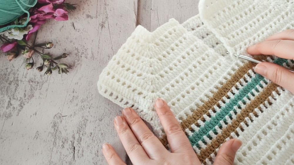 • Hidden Color Change: You join new colors at the underarm or side of the body, preventing the seam from showing prominently on the front panel.