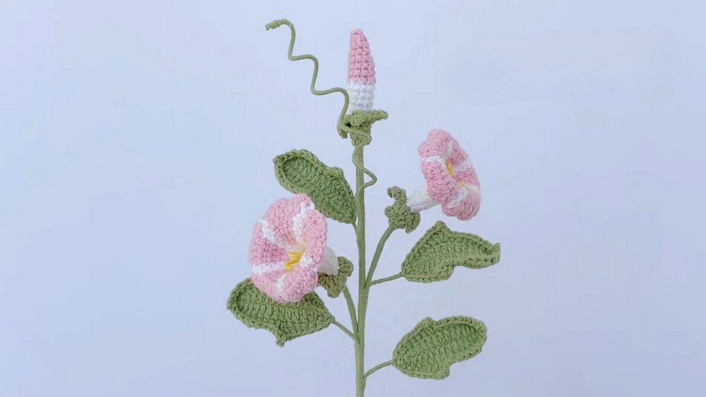 This tutorial provides a detailed walkthrough for creating a complete Morning Glory bunch, including an open bloom, a developing bud, heart-shaped leaves, and a climbing vine. You will use tapestry crochet techniques to create the realistic "star" pattern inside the flower, resulting in a professional-grade floral arrangement perfect for gifting or home styling.