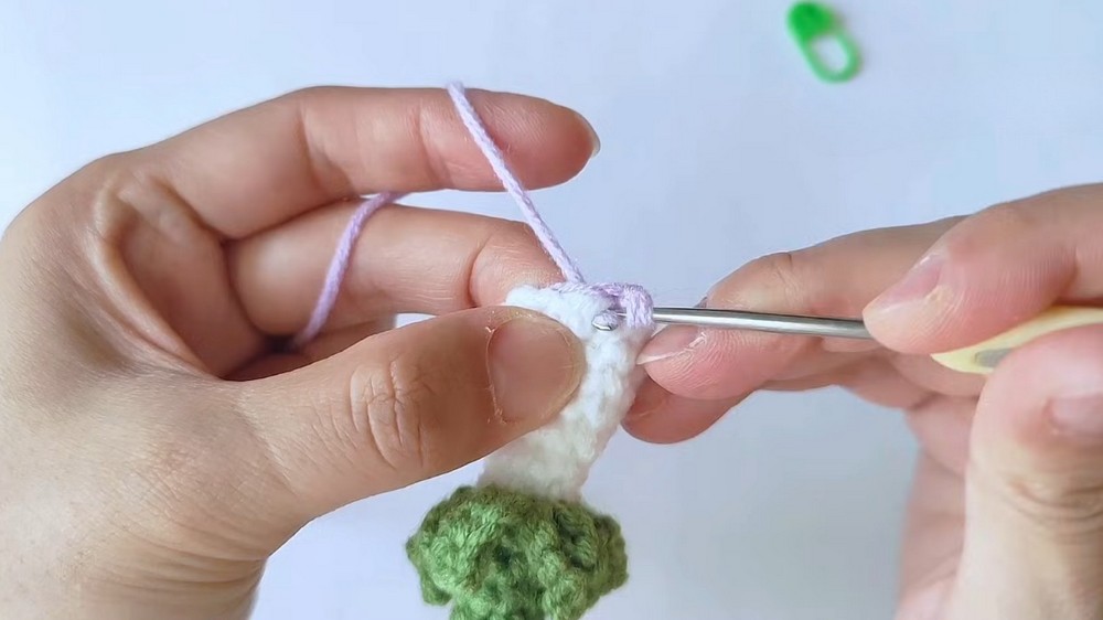 Yarn: 4-ply cotton or milk cotton yarn in Green (sepals/leaves), White (center), and Purple (petals).