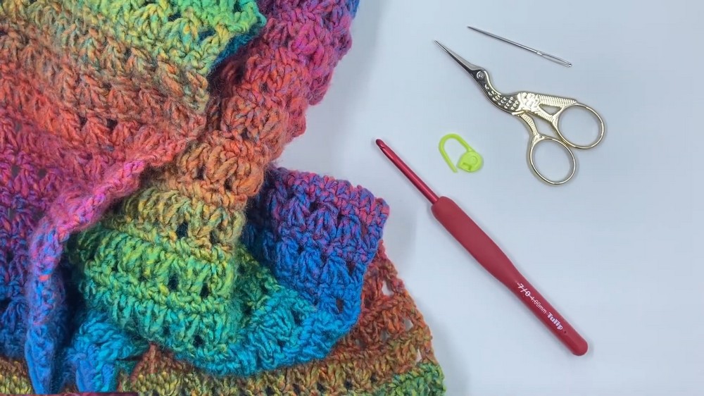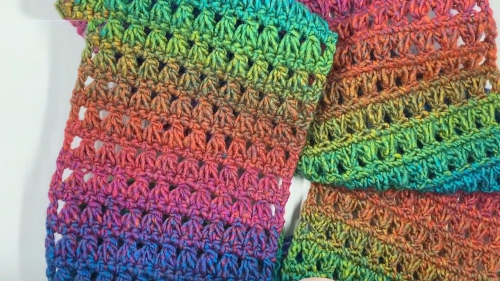 The process alternates between triptych rows and rows of single crochets, making it a straightforward project. Completed with a final row of single crochet stitches to balance the design, the scarf is ready for finishing touches like weaving in the yarn tails.