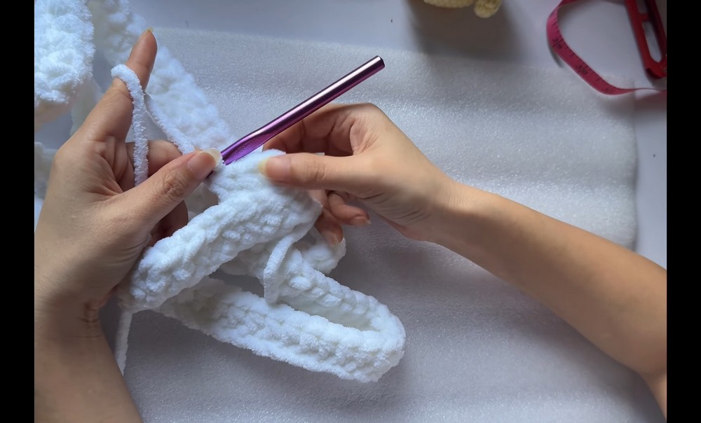 - Work two rows of HDC using the same back-loop-only method used for the scarf to maintain consistency in texture.