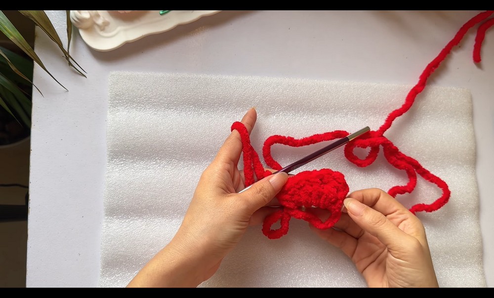 - Work 5 HDC stitches into the ring. Tighten the loop, but don’t close it completely.