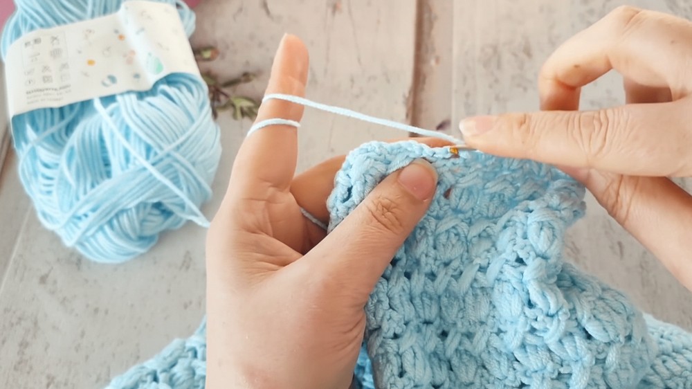 - Use 2 chains to space out the buttonhole areas evenly, reinforcing with single crochets in the next round.