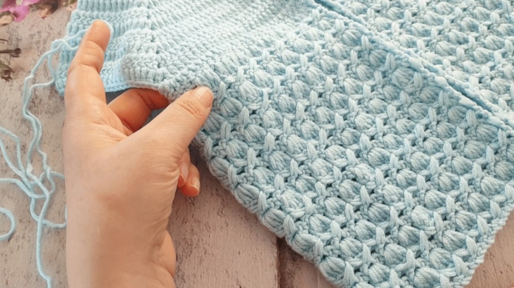 - The body alternates between fan-like groups of double crochets and chain spaces, forming a beautiful checkerboard pattern.