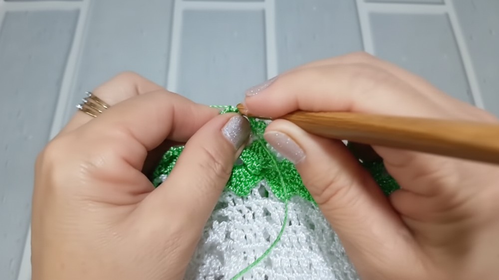 In the mid stage, repeating stitch patterns such as single crochet, double crochet, or shell stitches form the body of the cover, providing texture, elasticity, and decorative appeal. Optional accents, like scalloped edges or floral motifs, can enhance the overall aesthetic.