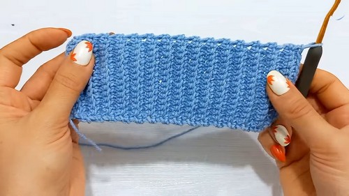 - Work single crochets into the back loop only of each stitch across until the last stitch.