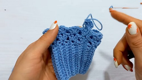 - Repeat this sequence around the top of the band, skipping two row tops between each shell (sequence of 2 double crochets, chain 1, 2 double crochets).
