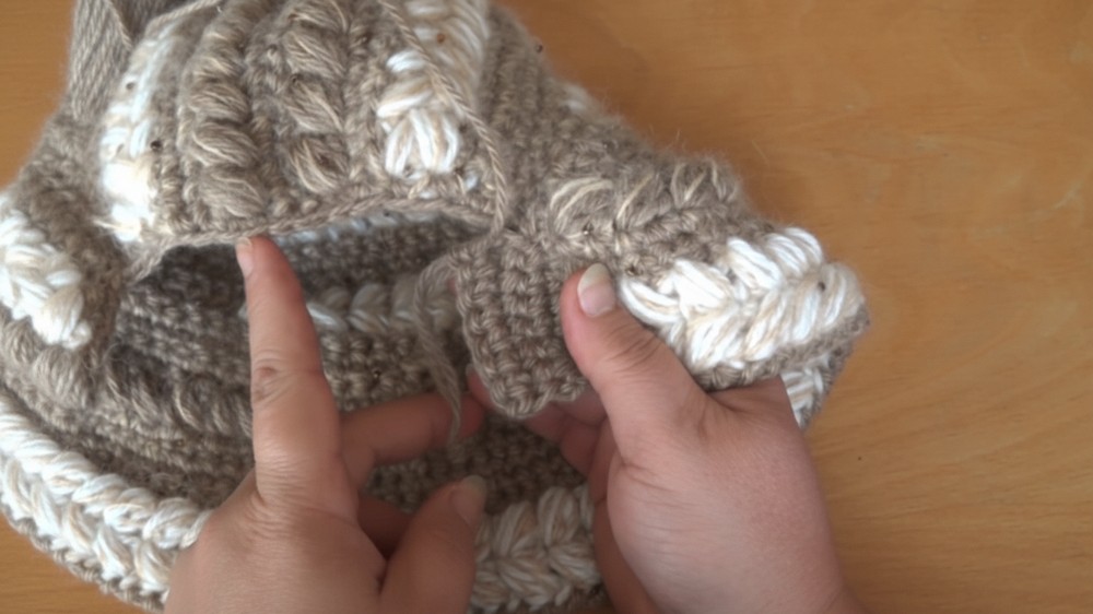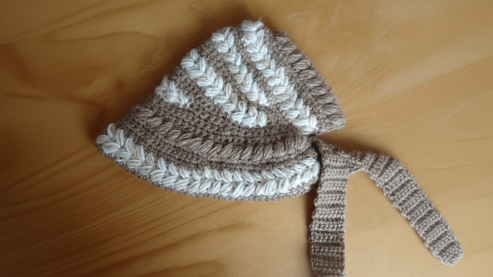 You have established the textured back and front flap of your Bonnet Hat. Continue repeating the pattern in Part 3 until the hat reaches the desired depth on the face. Finish by attaching a braided yarn tie to the side seams and adding a final SC border to smooth the edges.