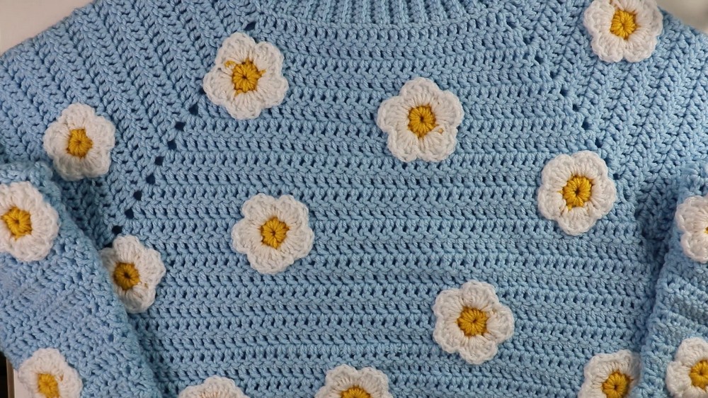 - Make the desired number of flowers and sew onto the sweater using a tapestry needle.