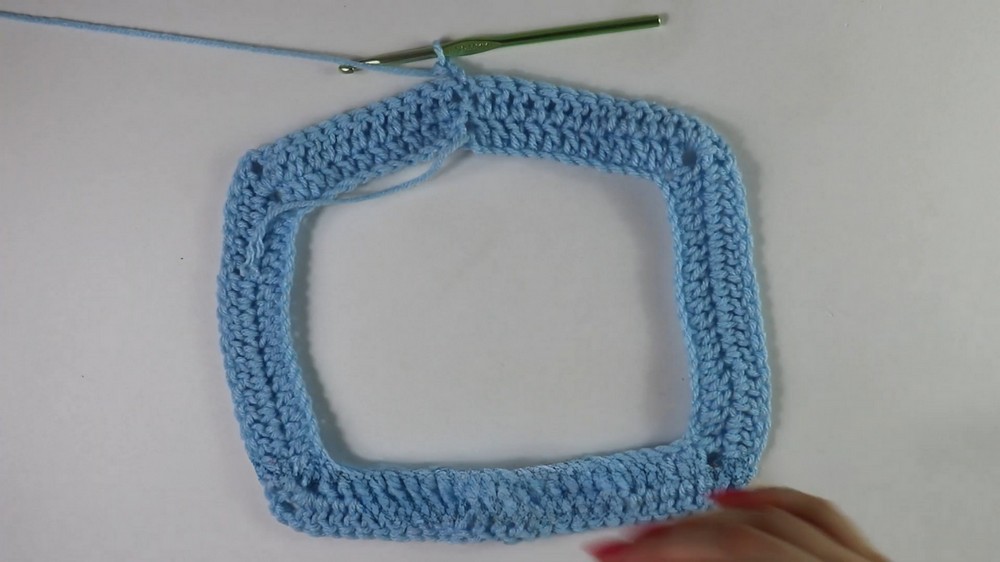 - Continue with 16 dc to the next corner, 22 dc after, third corner, 16 dc, fourth corner, and finish with 11 dc.