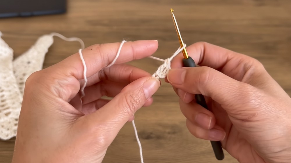 - Add 3 more chains and sink your hook into the foundation chain to create a double crochet. This forms the base of the bustier.