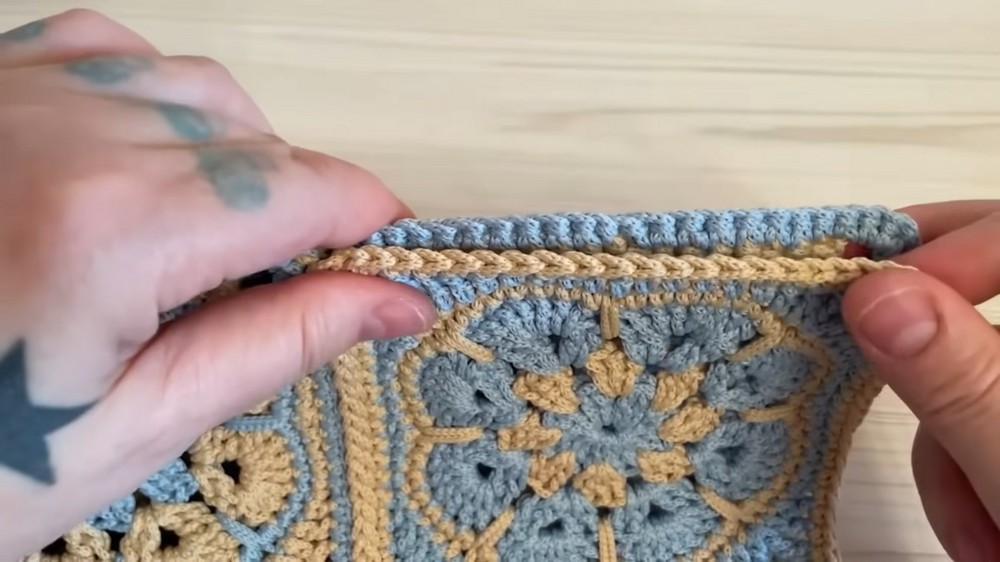 When joining your motifs, you must consistently insert your hook through the back loop only of the top chain on both squares. This technique ensures that the seam remains flexible and thin, making the joined fabric look virtually seamless and allowing the finished bag to lie flat and fold correctly.