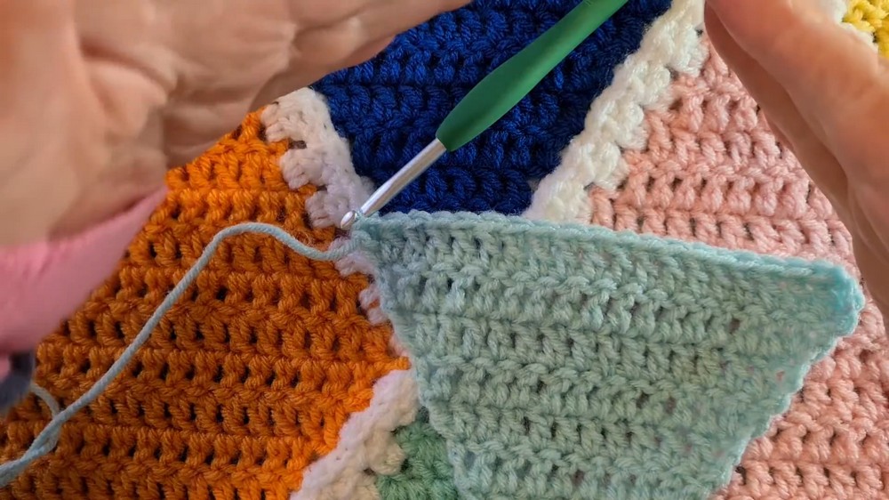 Flat-edge triangles are added along the top and bottom rows to maintain clean, straight edges, while smaller triangular borders and corner pieces complete the rectangular frame. Referencing crochet charts during each step helps keep the stitching clear and consistent, allowing you to confidently navigate the detailed design process.