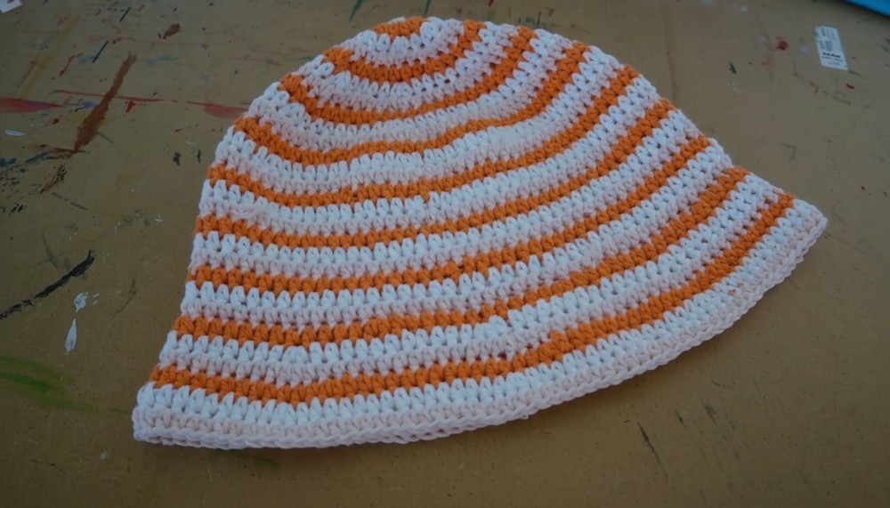 The main body is crocheted using basic stitches like single crochet or half double crochet, creating a steady and rhythmic pattern.