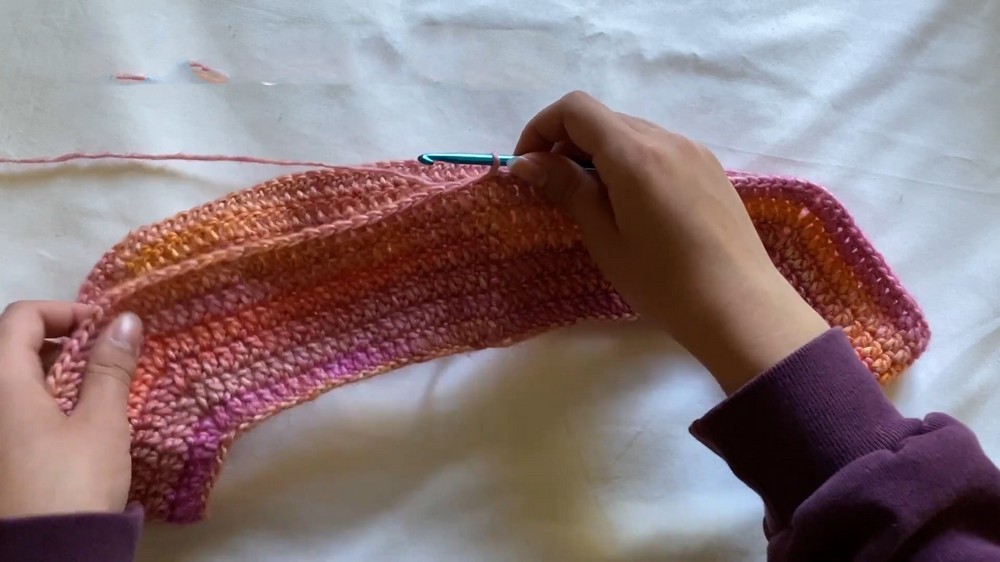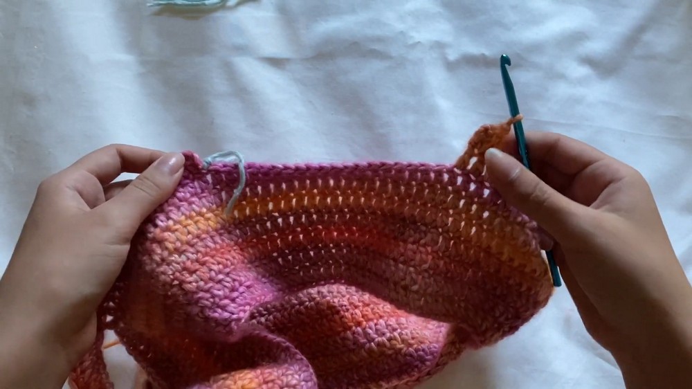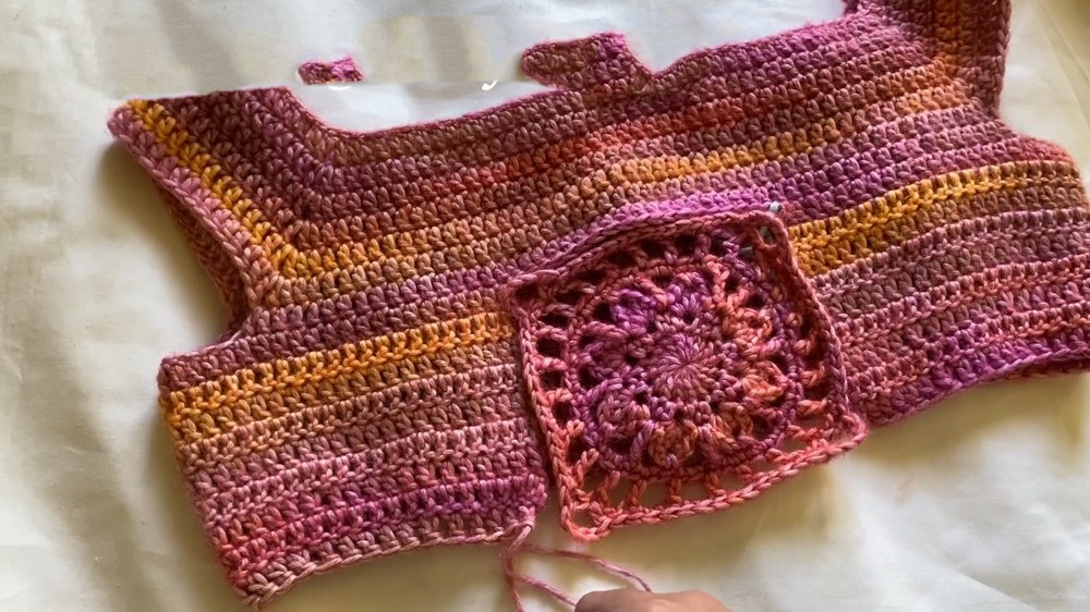 After that, the sleeves are sectioned off by chaining stitches that connect under the armholes, leaving space for comfortable movement. The body is then worked in rounds of DC to form the main tube.