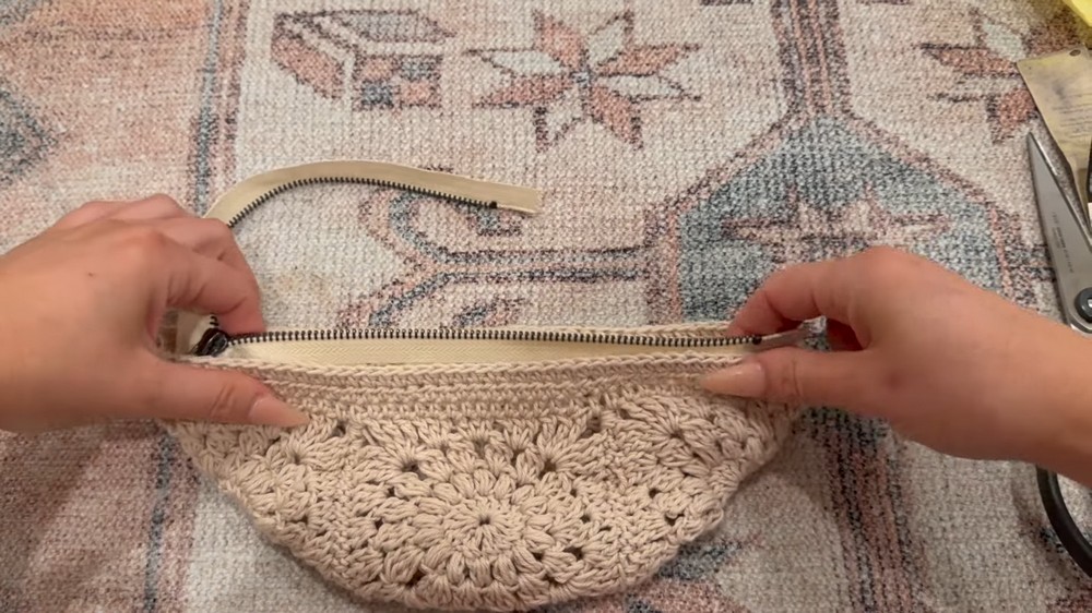Tip: When sewing the zipper, open it halfway first. This makes it much easier to sew around the "head" of the zipper and ensures that the teeth don't get caught in the bulky crochet yarn as you work. [19:22]