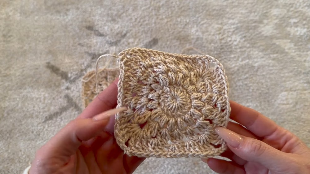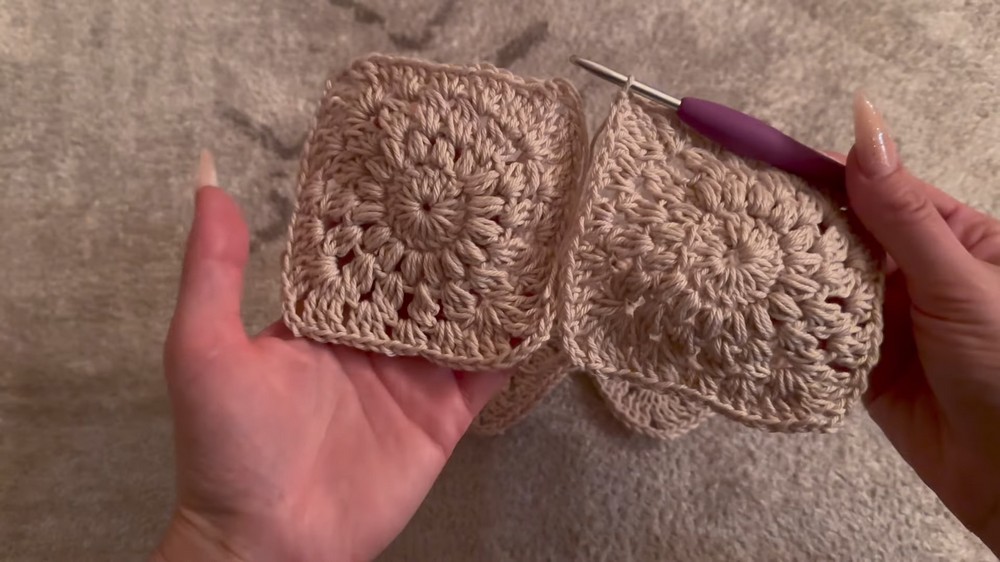 Puff Stitch Texture: The granny squares feature two types of puff stitches (standard and double crochet puff), creating a thick, "bubbly" floral texture in the center. [03:05]