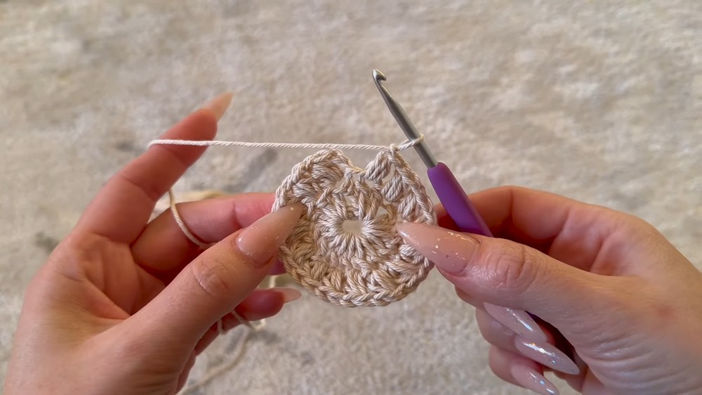 The Center: Chain 5 and join with a slip stitch to form a ring. Work 16 double crochets into the ring. [02:09]