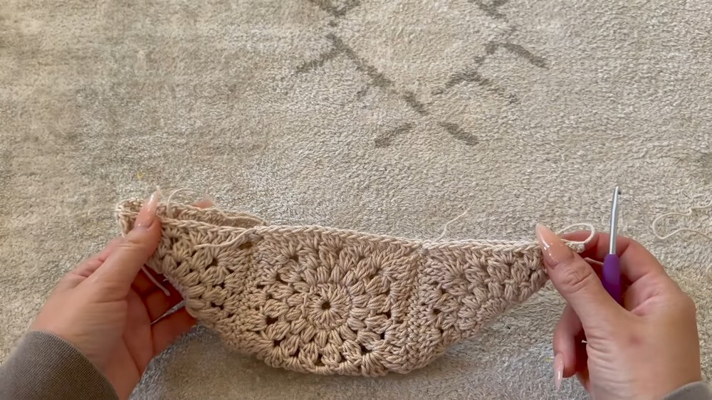 The Fold: Fold the two end squares up at a diagonal. Place the fourth square on top and single crochet it to the remaining open edges to form the bag's body. [10:21]