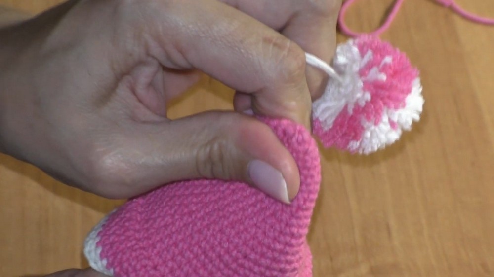 Two-Tone Pom-Pom: The tutorial shows you how to wrap and trim both the colored yarn and the white yarn to create a festive, layered pom-pom effect for the cap's end.