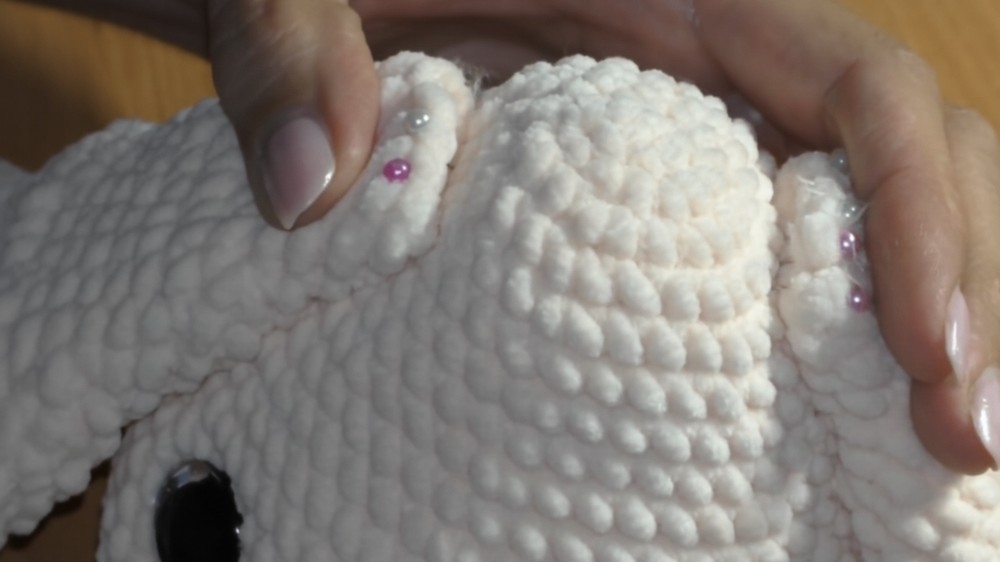 For a professional finish, perform the facial sculpting and sew the ears and head on using a long doll needle and YarnArt Jeans thread instead of the fluffy body yarn. This thin, strong thread gives you the necessary control to securely attach parts and create precise, clean indentations for the eyes and mouth, which is essential for the final look of the toy.