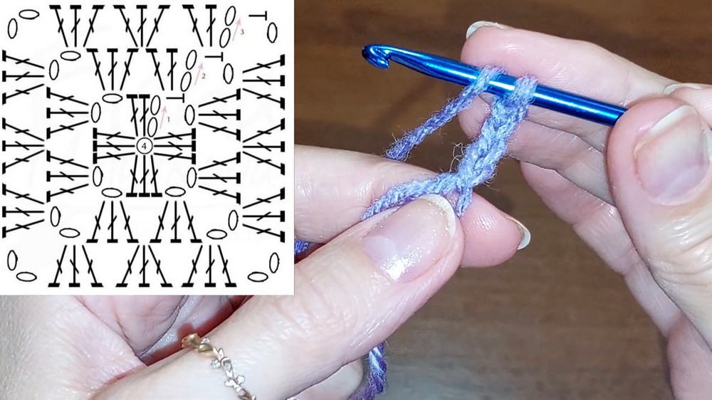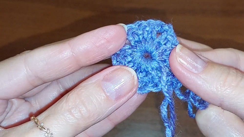 To create an invisible start to each square round and avoid a distracting seam, always replace the traditional Chain 3 with the modified standing DC (pull up a long loop, wrap, and work as a regular DC).