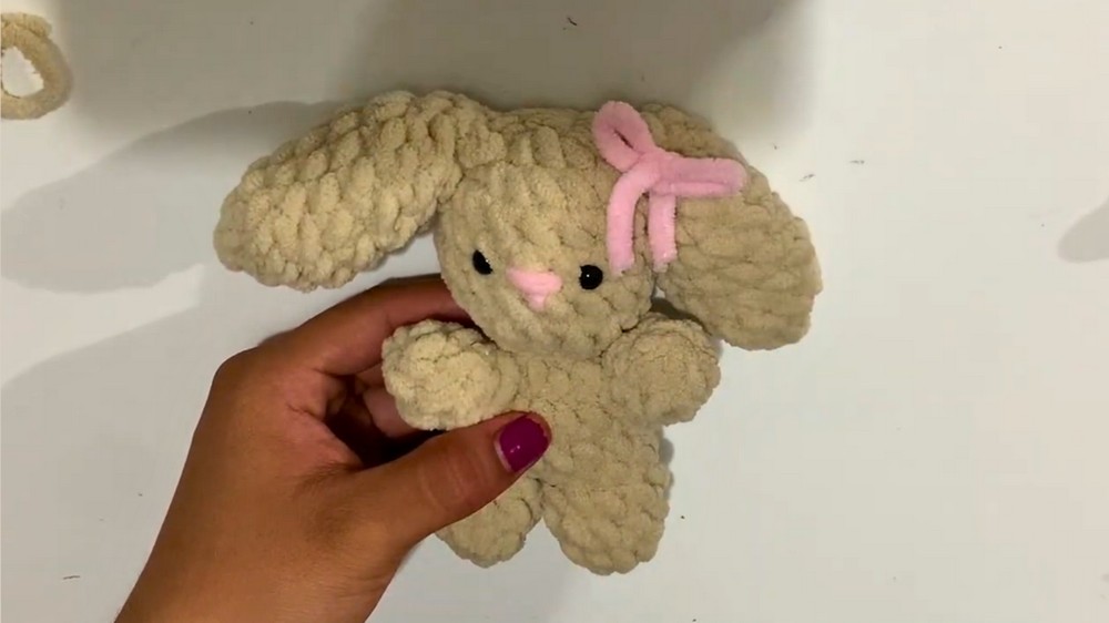 When sewing the parts together, bring all your yarn tails to the same spot at the bottom of the toy. Tie them in a single knot and push the knot inside the body to hide it and secure all limbs at once.