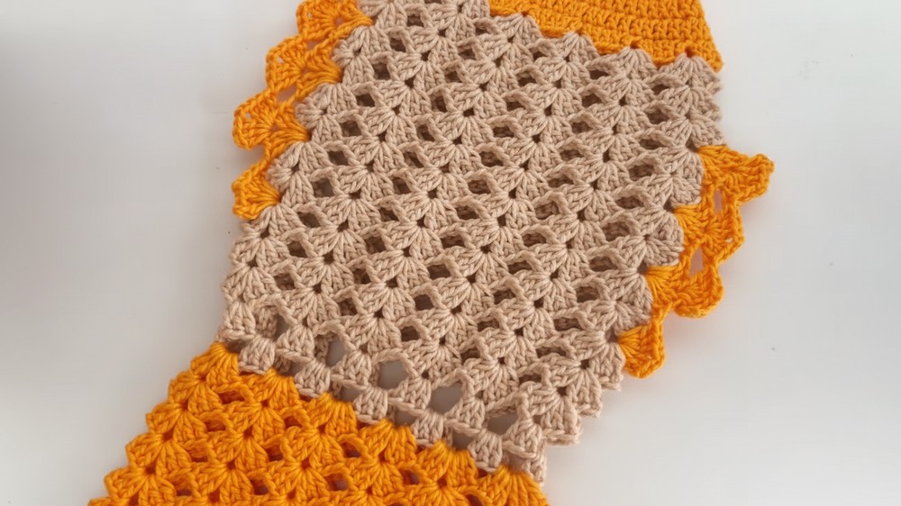 This project features a unique fish shape and uses two different sized rings—a smaller one for the mouth/head and a larger one for hanging the dishcloth. The fish body uses simple DC rounds and transitions to decorative Shell stitches (Leques) for a textured, layered look. The tail is constructed and folded to create a distinct, firm fluke.