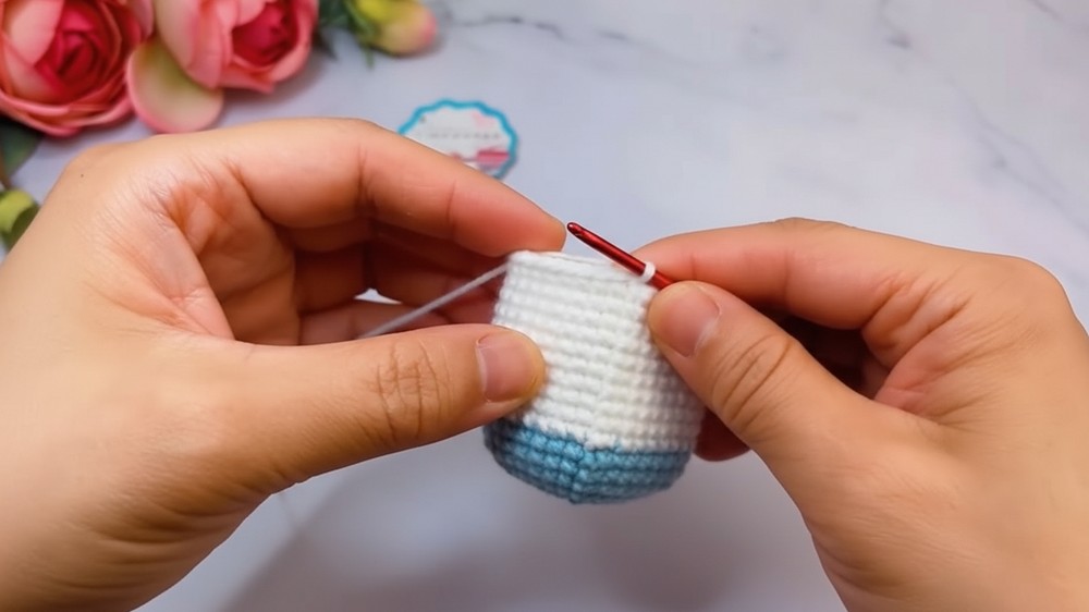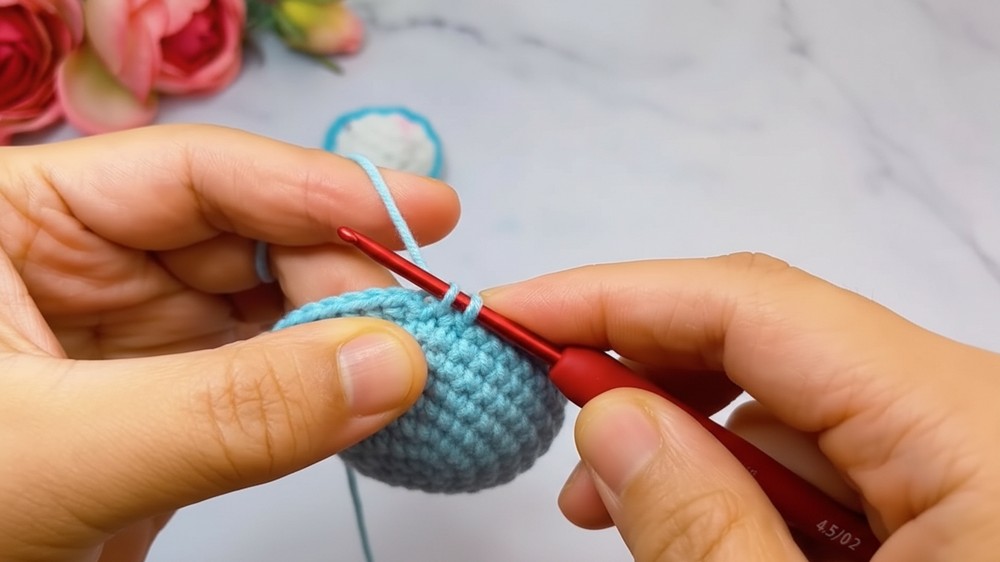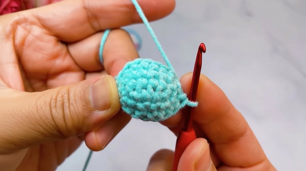 To build this adorable bovine pouch, you start by working rounds of single crochet into a magic ring to form a sturdy, spherical base.