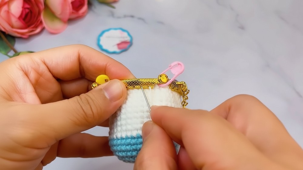 Once the main body is tall enough, you decrease the stitches to taper the opening and attach a small zipper or a metal clasp frame for security.