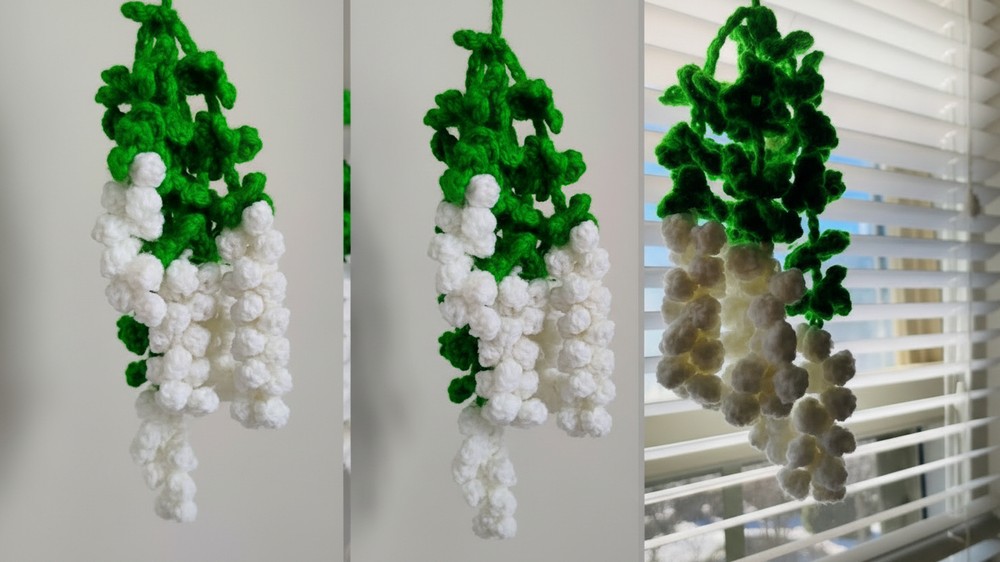 If you want to use this vine as a car mirror hanging, attach it to a small crochet planter base. The tutor recommends using a slightly smaller hook than suggested on the yarn label to ensure the jasmine buds stay tight and don't lose their "puff" shape over time.